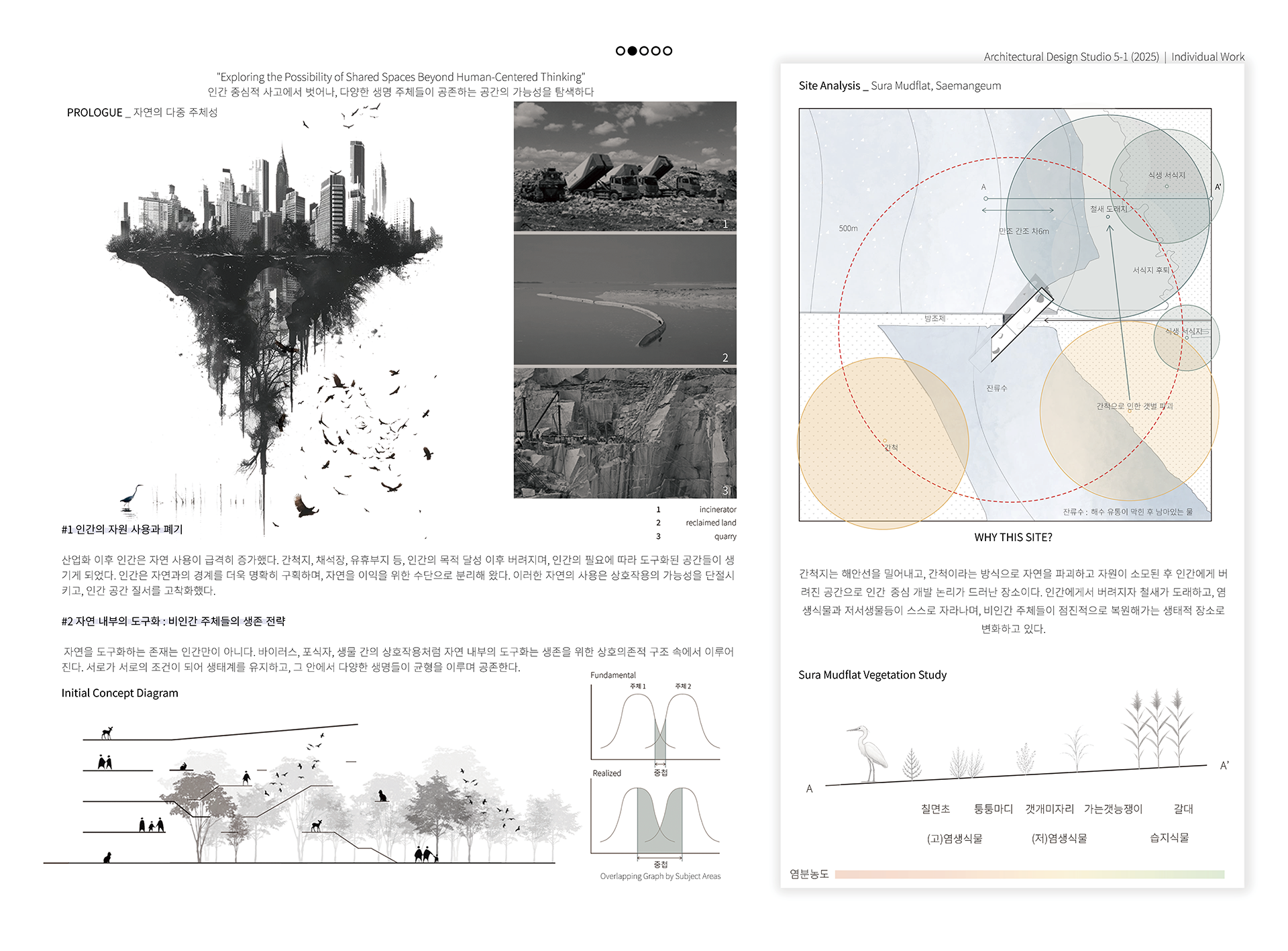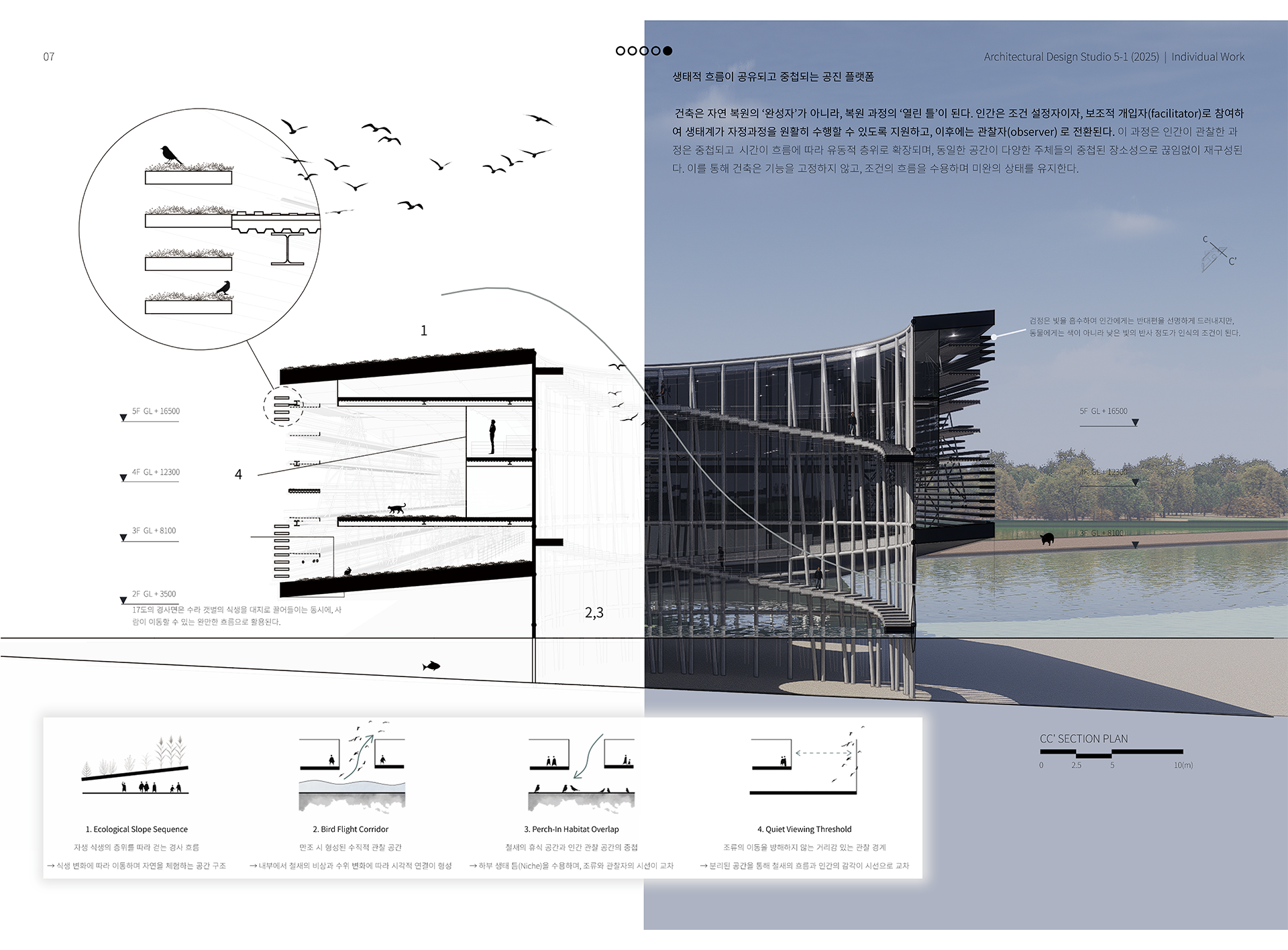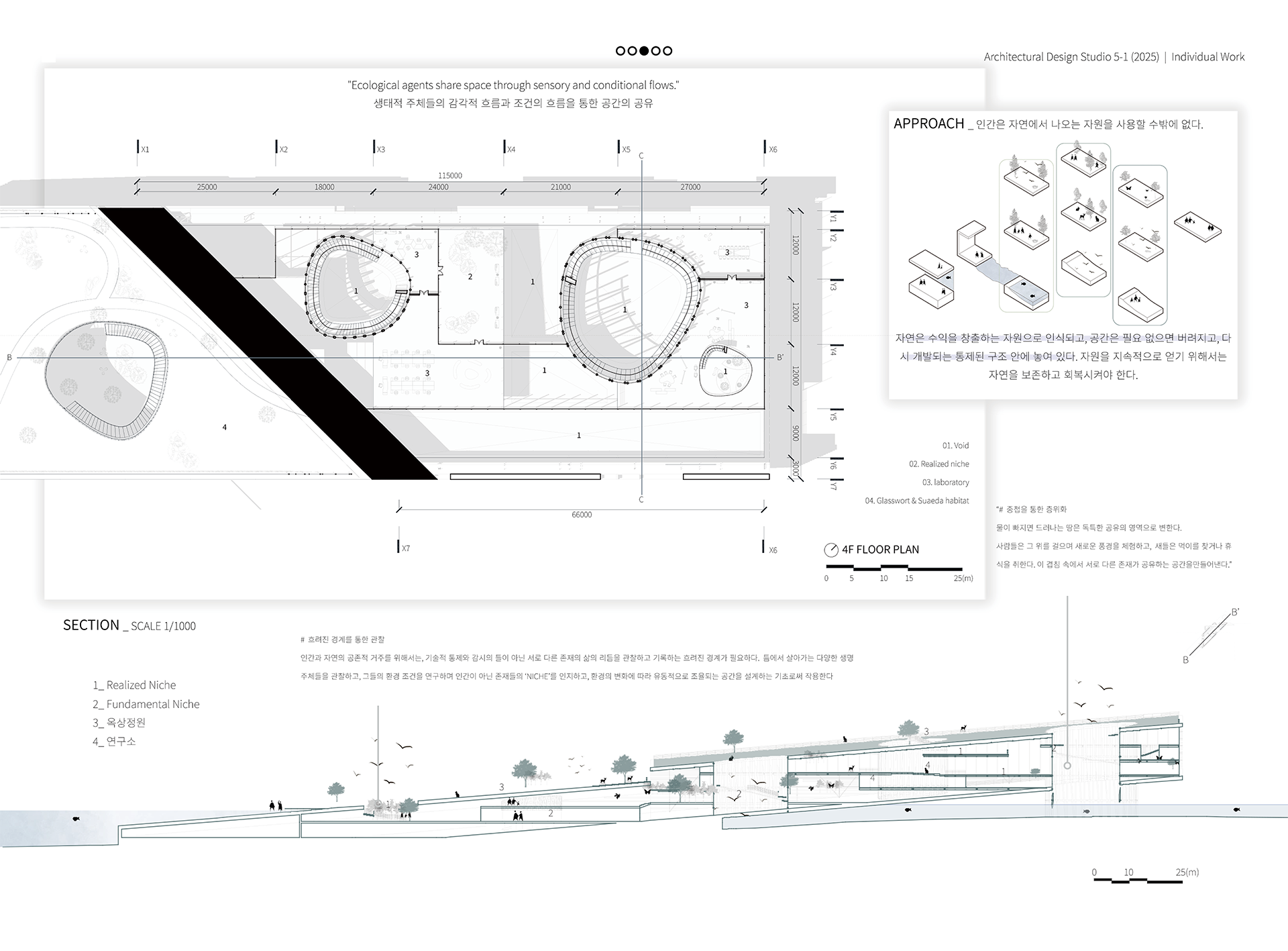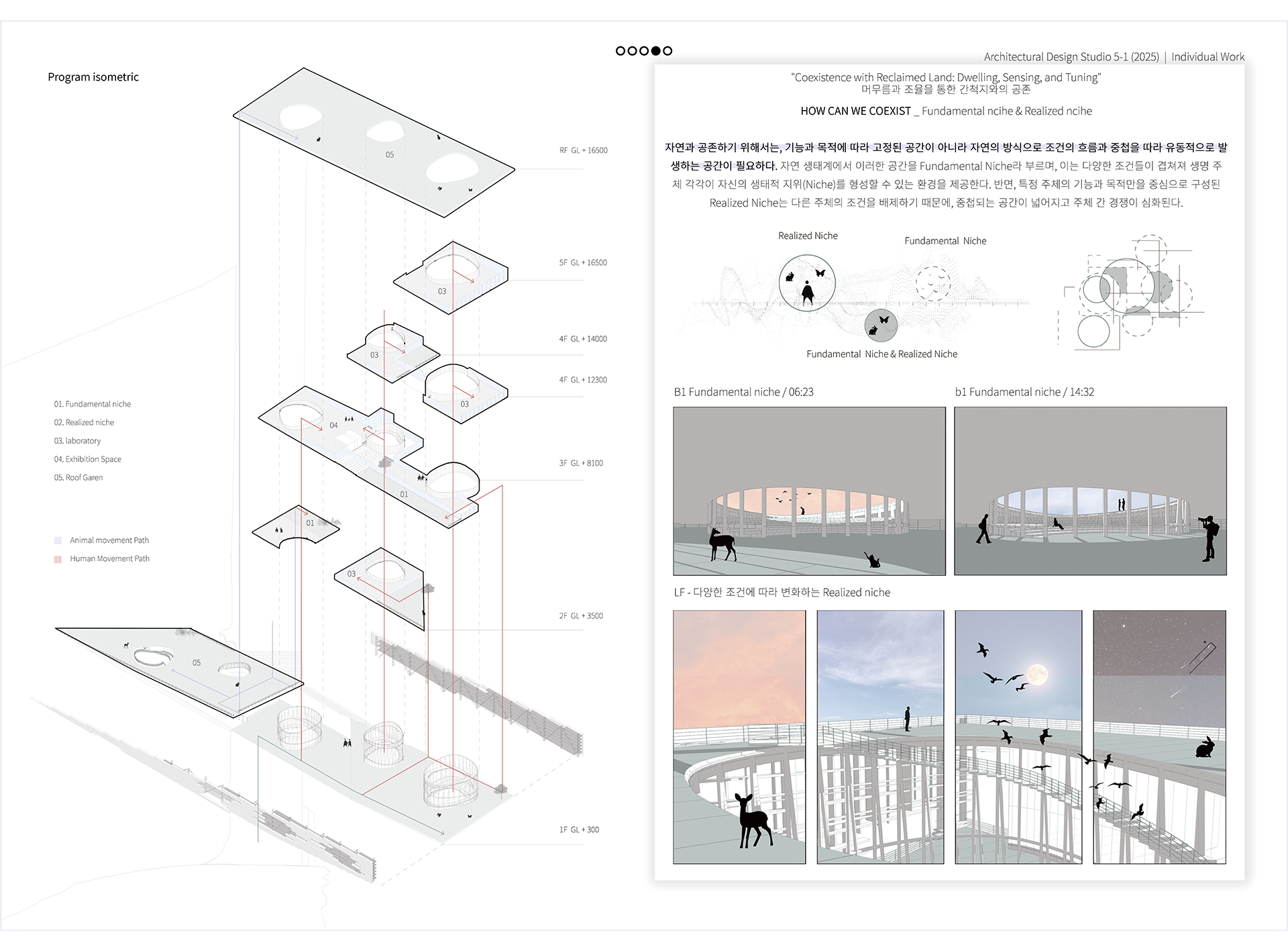 이 프로젝트는 자연과 인간의 흐름이 중첩되는 지점에서 발생하는 ‘생태적 틈(Niche)’에 주목한다. 공간은 고정된 기능이 아니라 조건에 반응하며 유동적으로 형성되고, 그 안에서 인간과 자연의 다양한 주체들은 각자의 방식으로 머물고, 이동하며, 사라진다. 자연 주체에 따라 변화하는 공간은 새로운 장소성을 만들어내며, 건축은 이러한 흐름을 수용하고 자연을 받아들이는 열린 무대로 자리한다. *nidus(niche) : 라틴어로 둥지, 생태적 틈