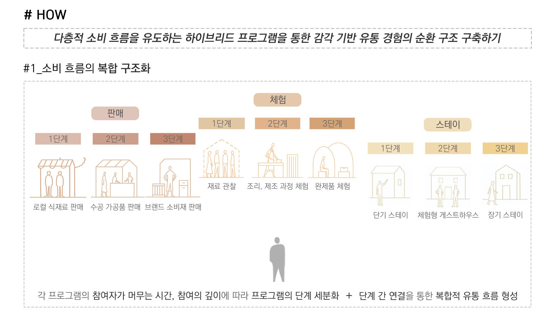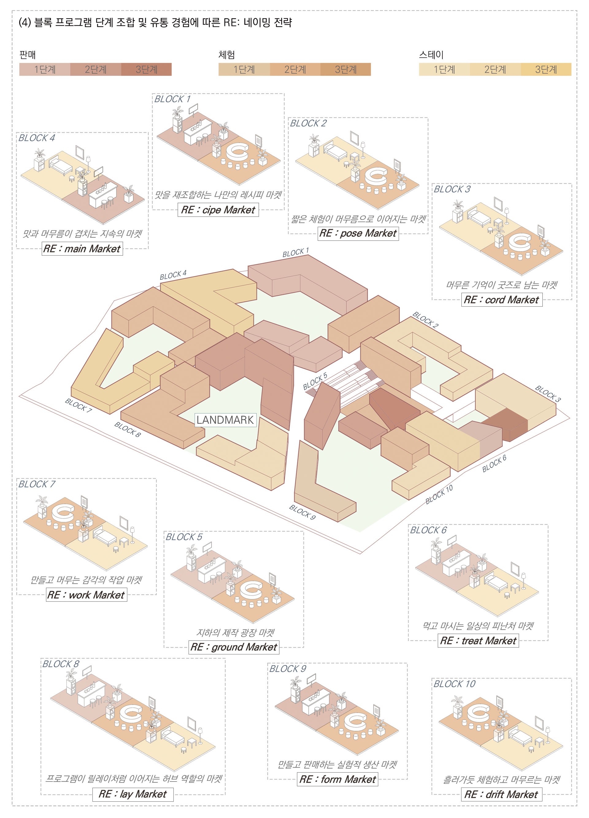 이곳은 단순히 물건을 사고파는 장소가 아니라, 판매–체험–스테이가 유기적으로 이어지며 확장되는 공간이다. 사용자는 로컬 제품을 구매하는 데서 그치지 않고, 직접 만들어보고 머무르며 경험을 기록하게 된다. 이 과정에서 소비자는 단순한 ‘구매자’가 아니라, 새로운 가치를 창출하는 참여자가 된다. 각 블록은 서로 다른 프로그램의 조합으로 이루어져, 고유한 테마와 개성을 가진 마켓 단위가 된다.