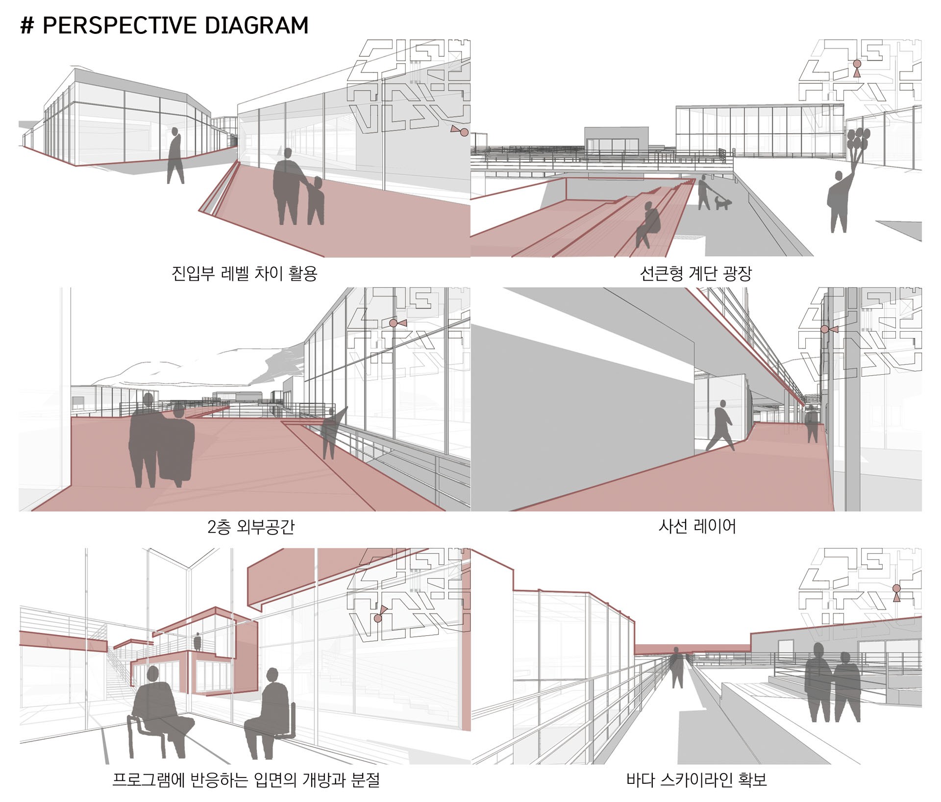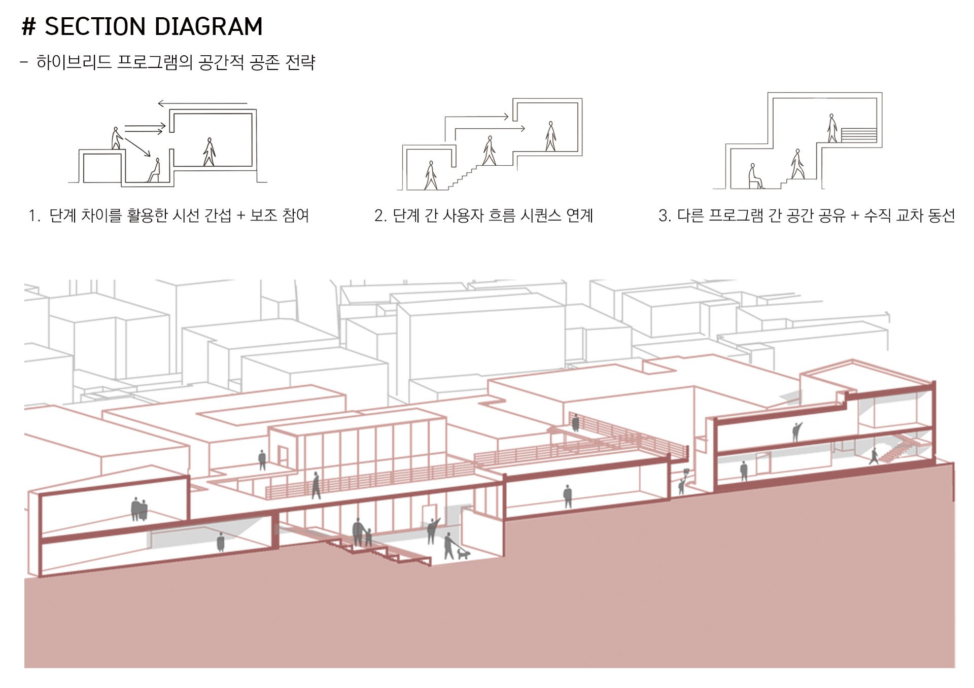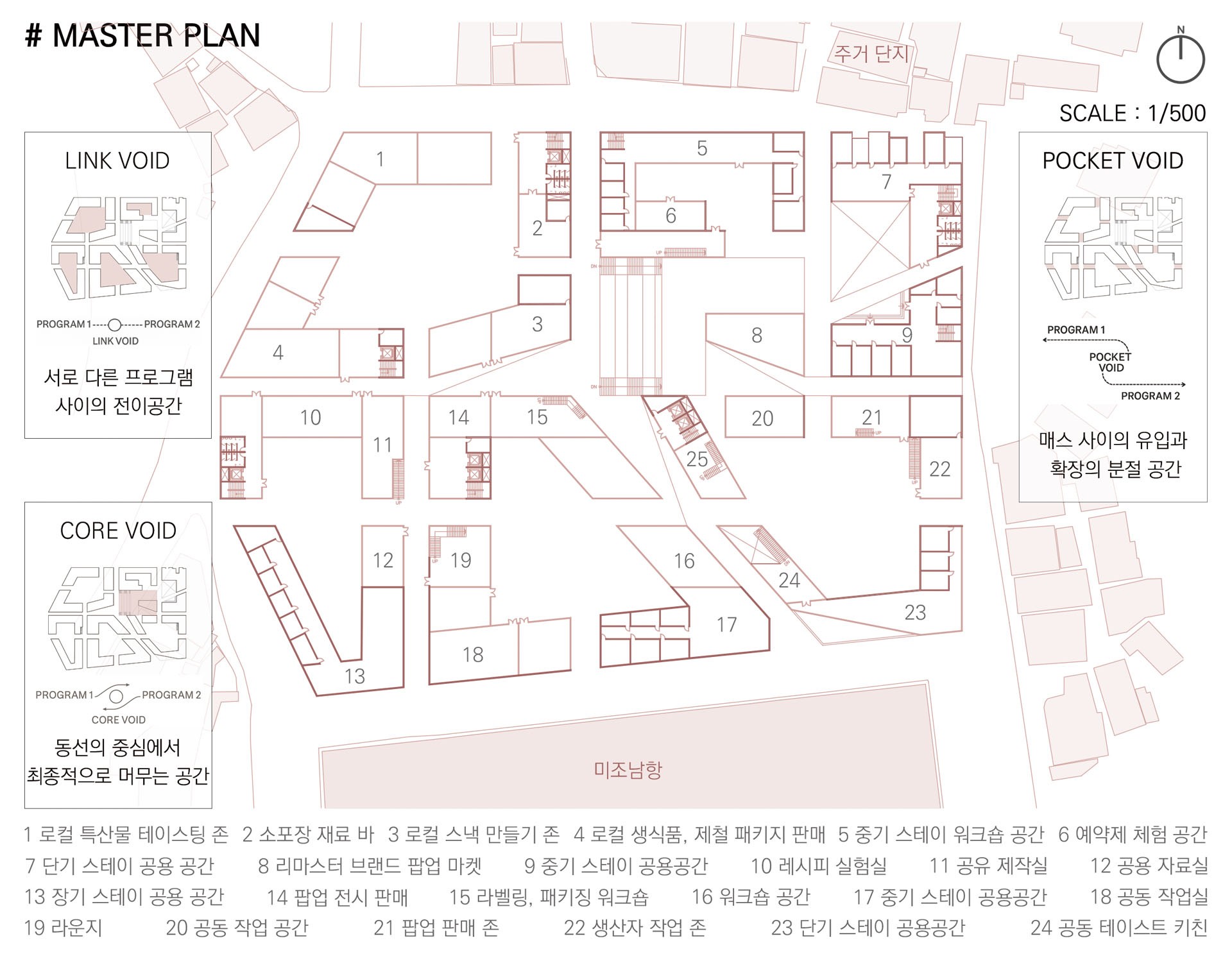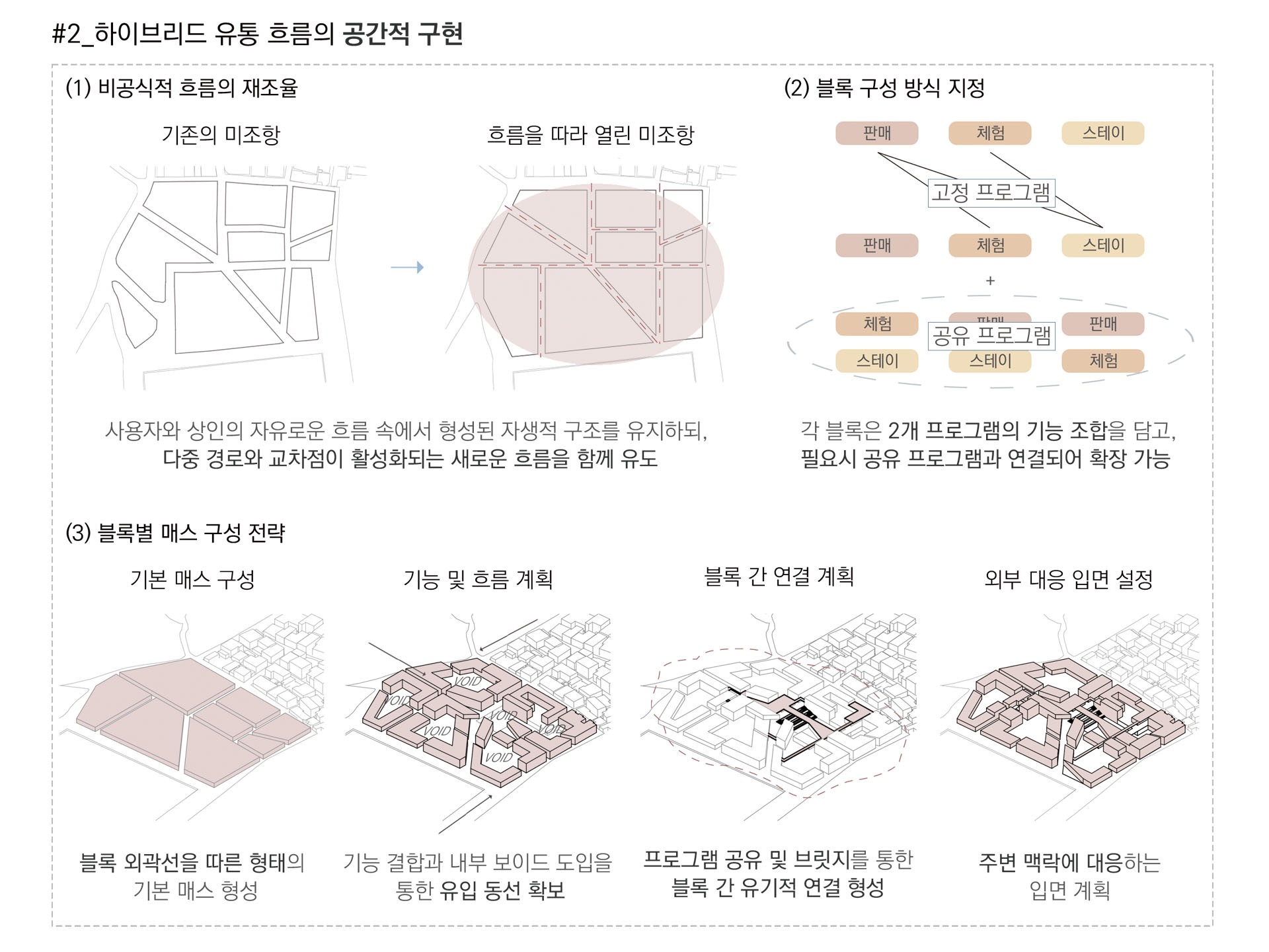 예를 들어, Re:cipe Market은 레시피 리마스터링 체험과 로컬 테이스팅 판매가 결합된 공간이다. Re:cord Market은 판매와 스테이가 교차하며 기억과 기록을 담아내는 장소이다. 이처럼 10개의 블록은 모두 ‘Re:’라는 접두 구조를 공유하며 하나의 브랜드 생태계를 형성한다. 블록 사이의 Void 공간은 가로와 건축 사이의 전이 영역으로 작동하며, 예상치 못한 만남을 유도하는 장치이다. 각각의 보이드들은 판매자와 체험자, 그리고 서로 다른 사용자들을 연결한다. 외부에서 내부로 스며드는 진입 시퀀스는 단순한 이동이 아니라, 새로운 시장 경험의 문턱이 된다.