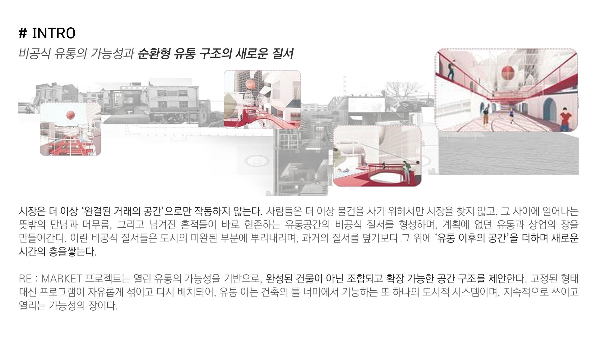 Re:market은 과거 시장의 활기와 현대 도시인의 생활 방식을 겹쳐낸 두 겹의 시장이다. 이는 ‘비공식적 유통의 가능성 – 예상 밖의 흐름, 새로운 질서’를 공간적으로 풀어낸 실험이다.
