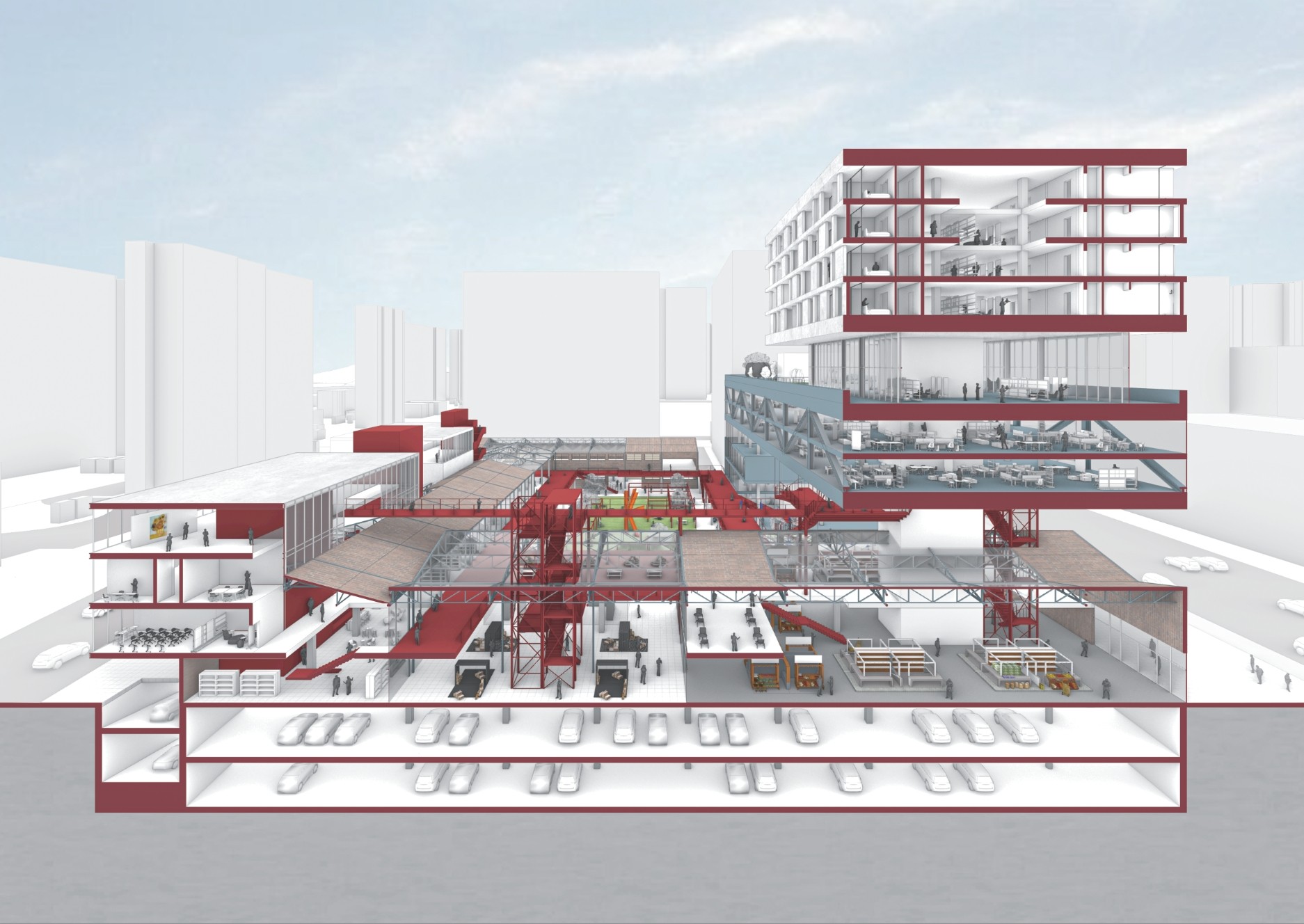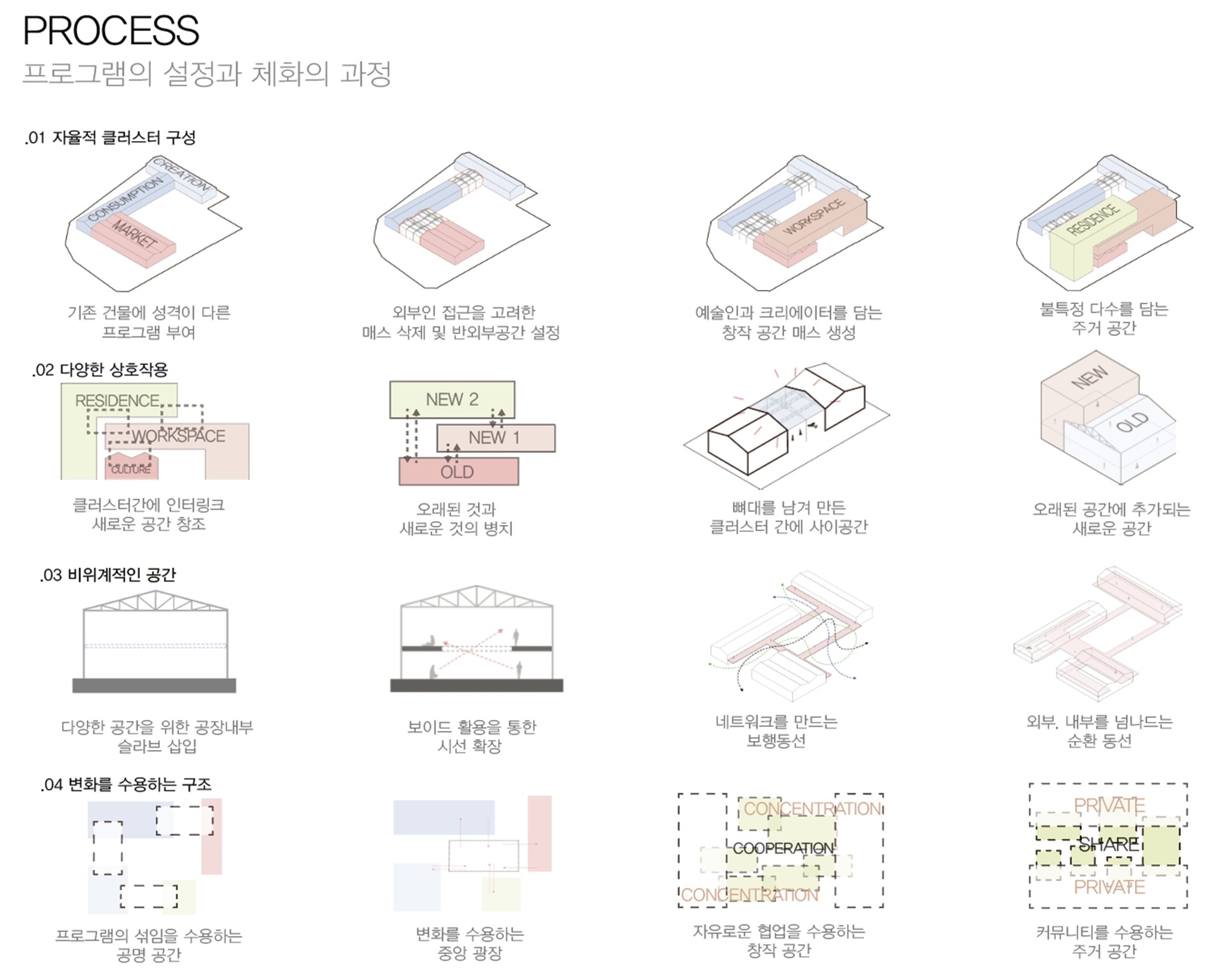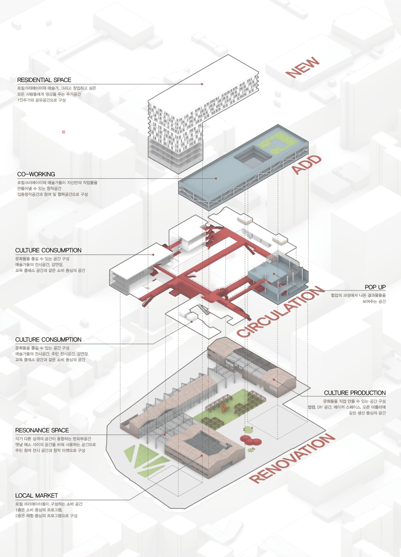 건축이 완공 이후 남아있는 건축물을 다시금 열린 결말을 건축적으로 구성하기 위한 방법론으로 ‘Polyphony(폴리포니)’ 음악적 개념을 건축적으로 차용하여 남아있는 건물과 새로 만들어지는 건축물이 서로 ‘공명’하는 프로젝트를 진행하였다.
