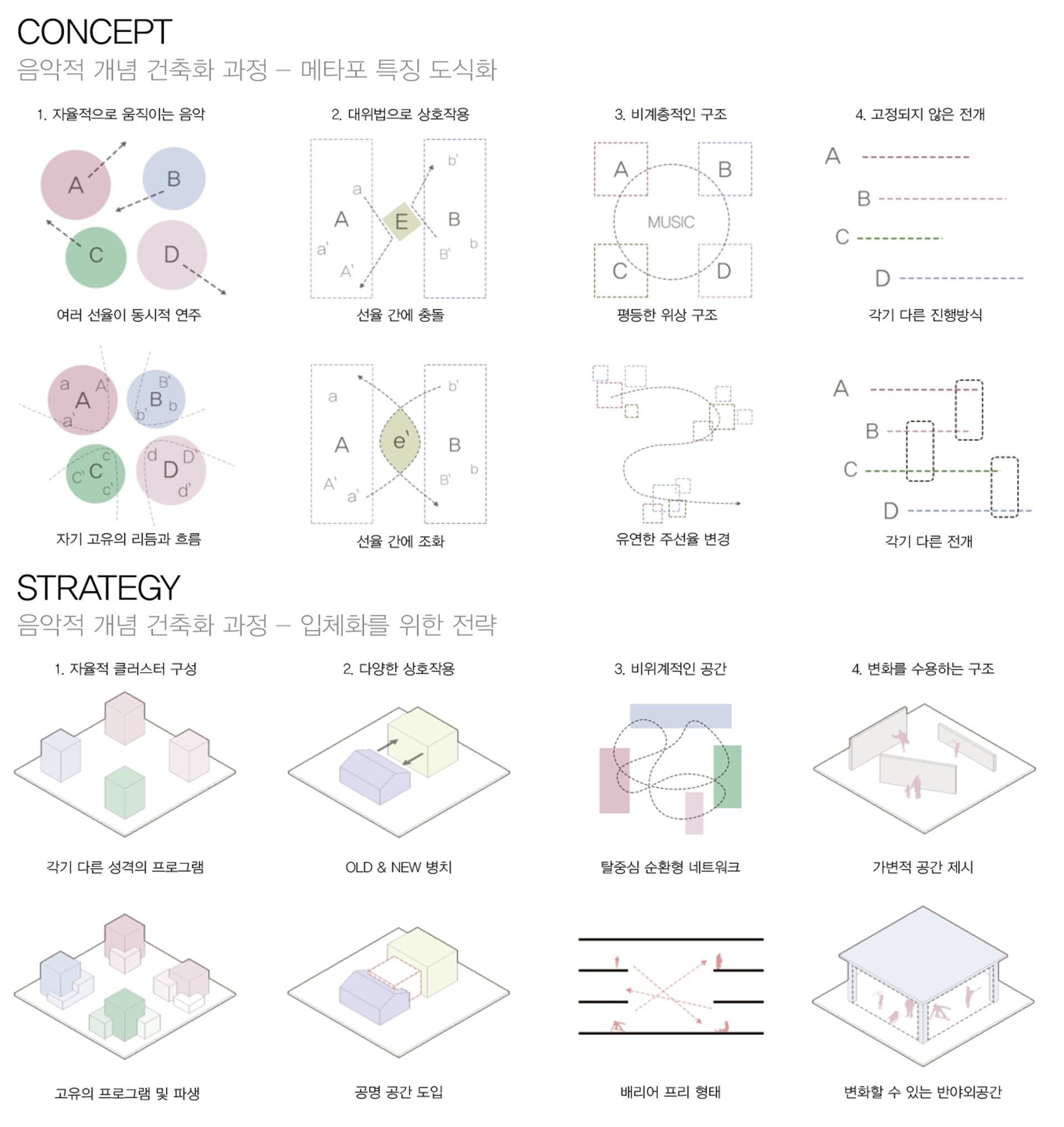 설계 체화 과정은 총 3단계로 이루어진다. 첫번째 단계로, 폴리포니의 음악적 특징을 건축적인 언어로 체화하기 위해 도식화 작업을 통해 4가지의 특징을 정리하였다. 두번째 단계로, 도출된 4가지의 특징들을 건축적 언어를 통해 입체화를 하기 위한 전략으로 변환한다. 마지막으로 입체화 전략을 사이트 분석에 입각하여 프로그램을 설정하고, 도식화된 과정을 바탕으로 건축적 특징을 도출해 설계에 적용하였다.