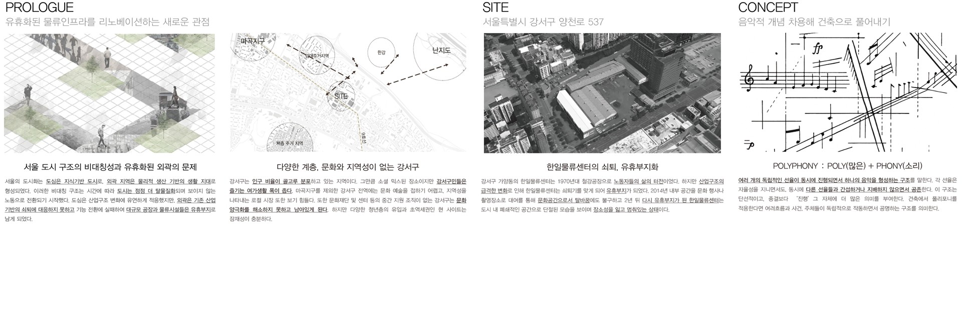 본 프로젝트는 서울 강서구 가양동의 한일물류센터 유후 산업시설을 대상으로 리노베이션을 진행한다. 한 시대를 지나 기능을 잃어버린 건축물은 그 자체로 멈춘 듯 보이지만 사실은 다음 이야기를 기다리는 공간이다.