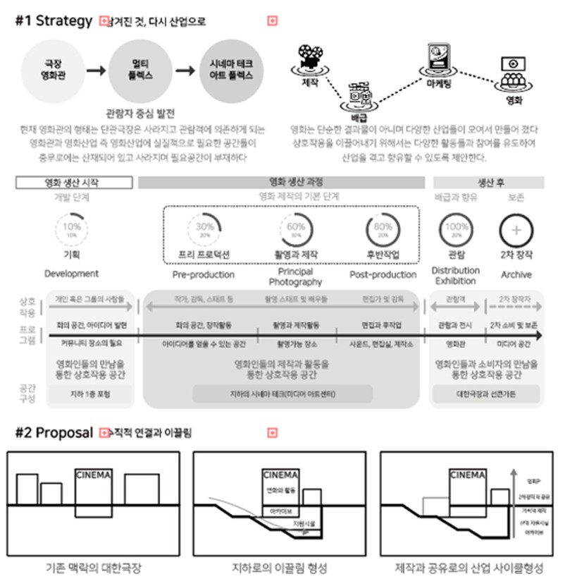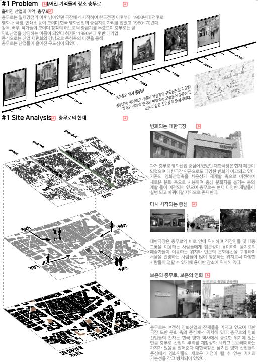 충무로는 한국영화 산업의 고향이며, 대한극장은 그 중심에 있던 단관으로 산업의 변화와 쇠퇴로 인해 기능이 멈추었다 하지만 충무로는 여전히 서울 문화의 중심축으로 작동하며 대한극장은 보존의 가치를 지닌 건축물이다, 본 제안은 변화를 수용하면서 보존을 병행할 수 있는 제안으로 대한극장의 지하 확장을 통해서 기능을 회복하는 데 초점을 둔다. 지상은 상영 기능을 유지하고 시대에 맞춰 변화하며 관람이 제작과 공유로 이어지는 현재적 활동의 장으로 재구성한다, 지하는 기억과 보존을 담당하는 아카이브로 연구, 교육, 제작, 전시까지 아우르는 전 주기의 기반을 구축한다, 두 층은 수직 시퀀스로 연결해 상영-학습-제작-공유의 흐름을 지속시키고 분산된 기능들을 연결함으로써 대한극장은 과거의 기반을 지키면서 오늘의 역할을 수행하는 작동 구조로 다시 재기능을 할 수 있게 된다.