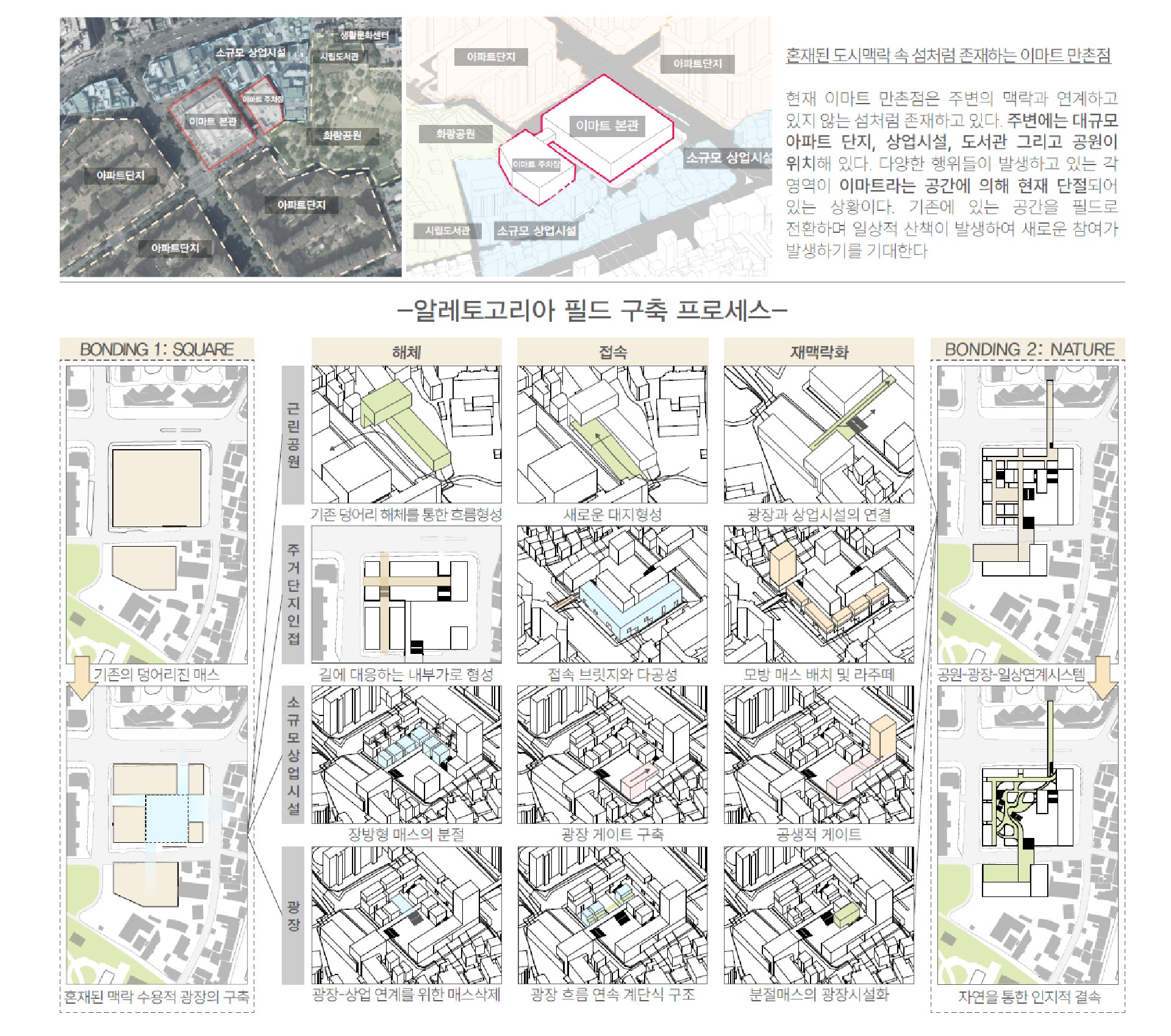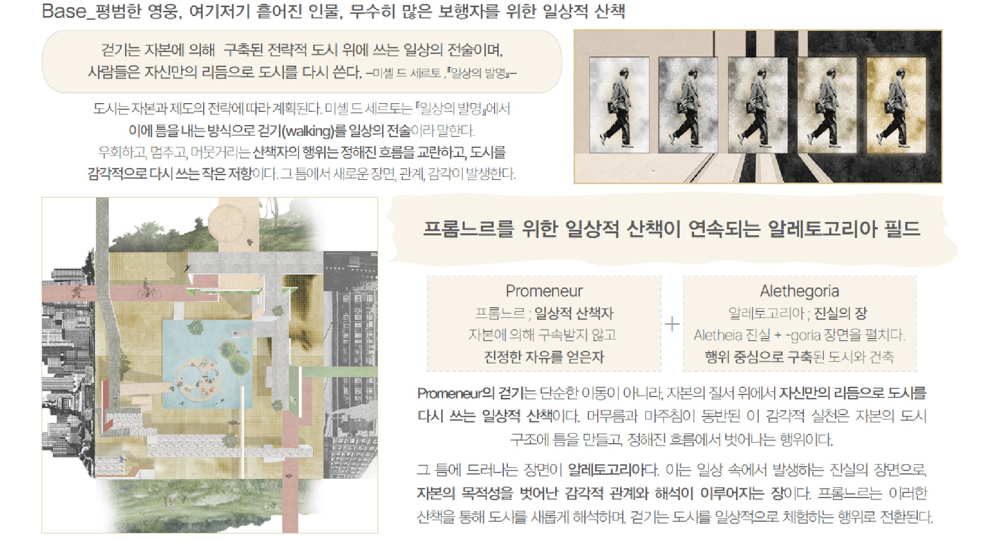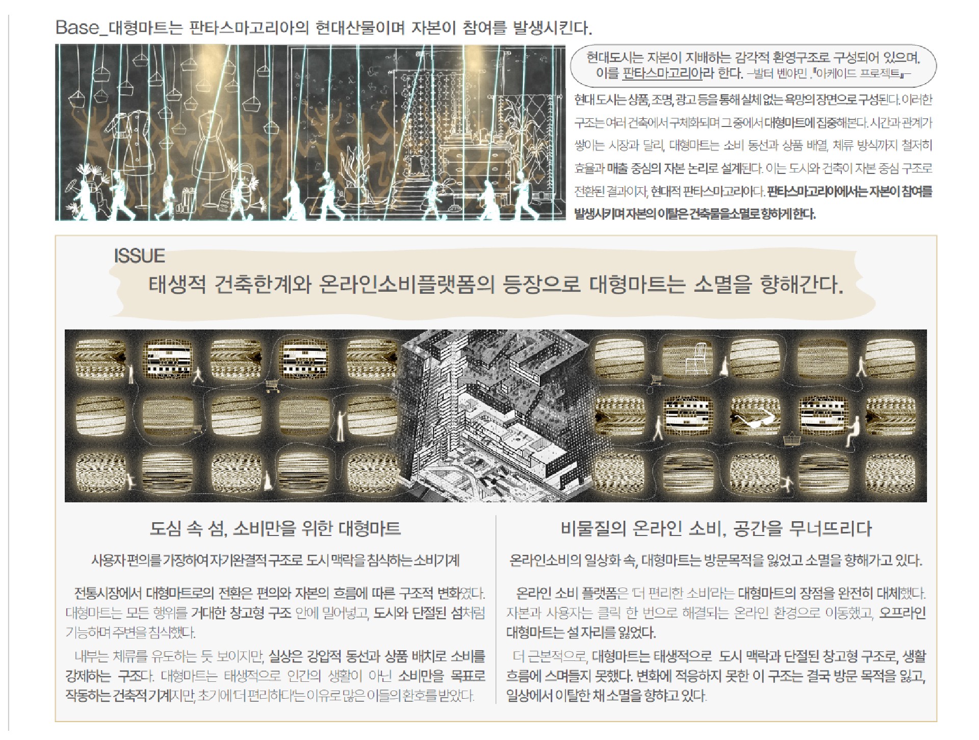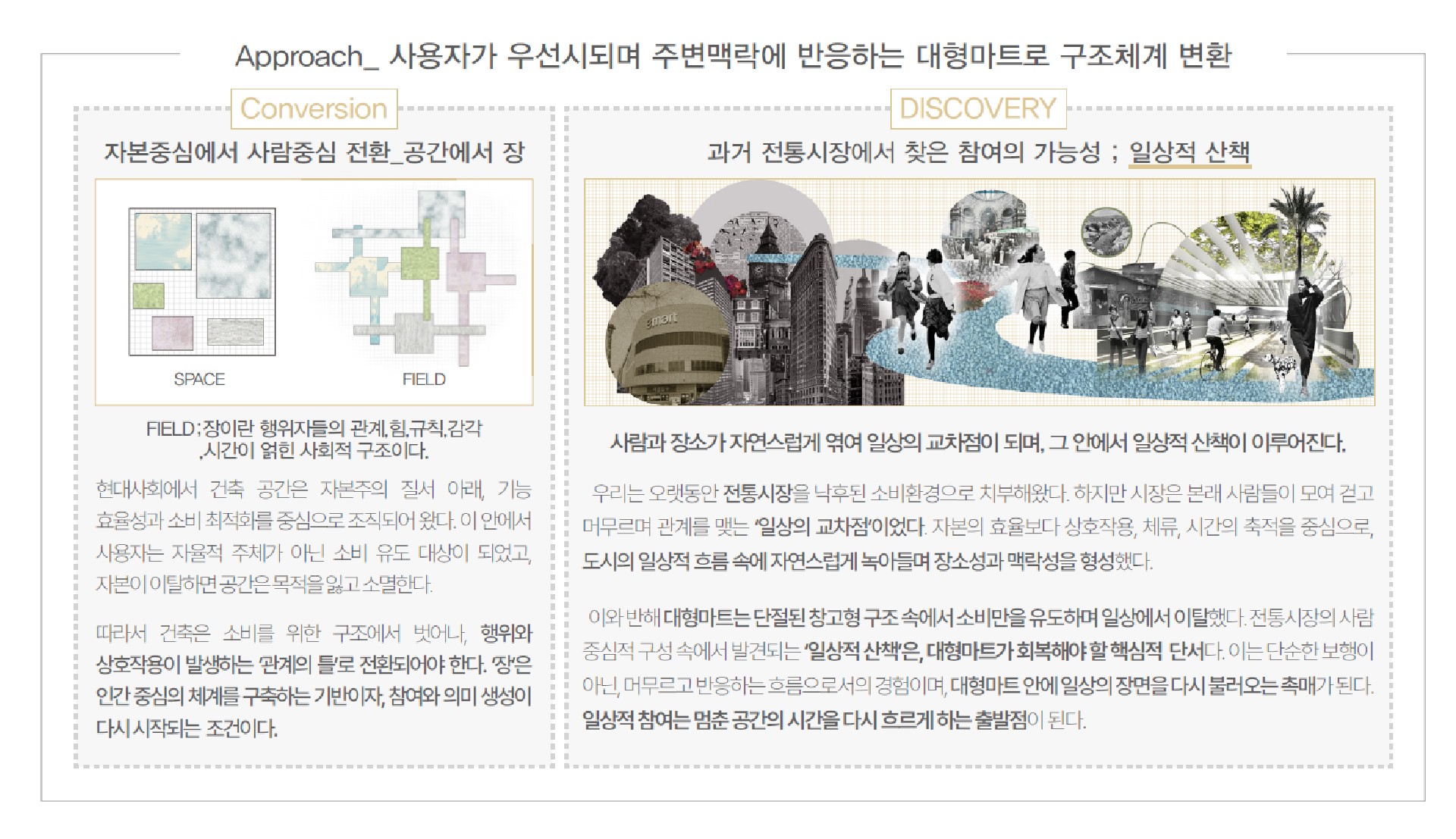자본이 떠난 뒤 멈춰버린 도시와 건축의 시간을, ʻ일상적 산책’을 통해 다시 흐르게 만들고자 했다. 평범해 보여 간과되었던 ʻ일상’과 ʻ산책’은 오히려 도시와 건축을 회복시키는 핵심 매개였다. 이번 설계를 통해 대형마트에 일상적 산책장을 구축함으로써 생기를 불어넣을 수 있음을 보여주고 싶었다.