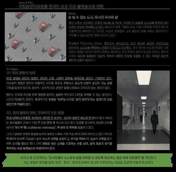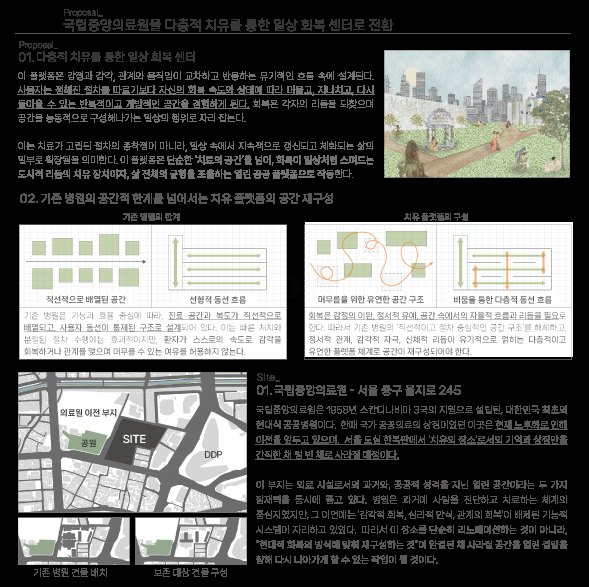 ‘테라피아 로사이’는 국립중앙의료원 부지를 현대인의 피로한 삶을 회복하는 치유 플랫폼으로 전환하고자 한 프로젝트이다. 기존 병원이 질병의 진단과 신체 치료에 국한되었던 한계를 넘어, 정서·감각·관계의 총체적 치유를 담아내는 새로운 공공적 공간을 지향했다.