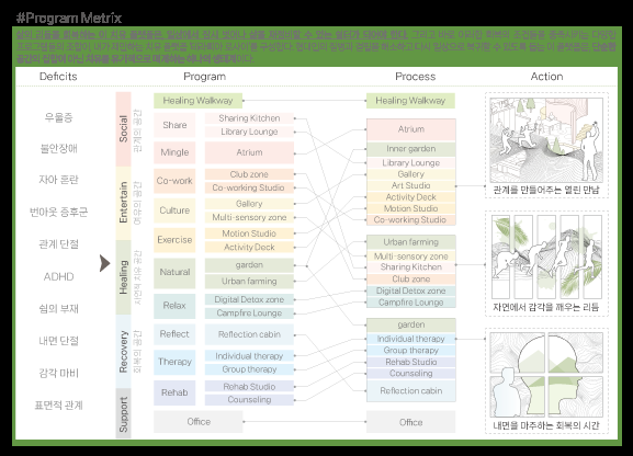 각기 다른 성격의 힐링 가든, 예술을 통한 감각 회복 공간, 병원과 연계된 테라피 프로그램 등은 감정적·감각적·관계적 회복을 가능하게 한다. 이는 치료가 필요한 환자만을 위한 단편적인 공간이 아니라, 일상을 살아가는 사람들이 자연스럽게 치유를 경험하며 삶의 균형을 회복할 수 있도록 돕는 열린 플랫폼으로 작동한다.
