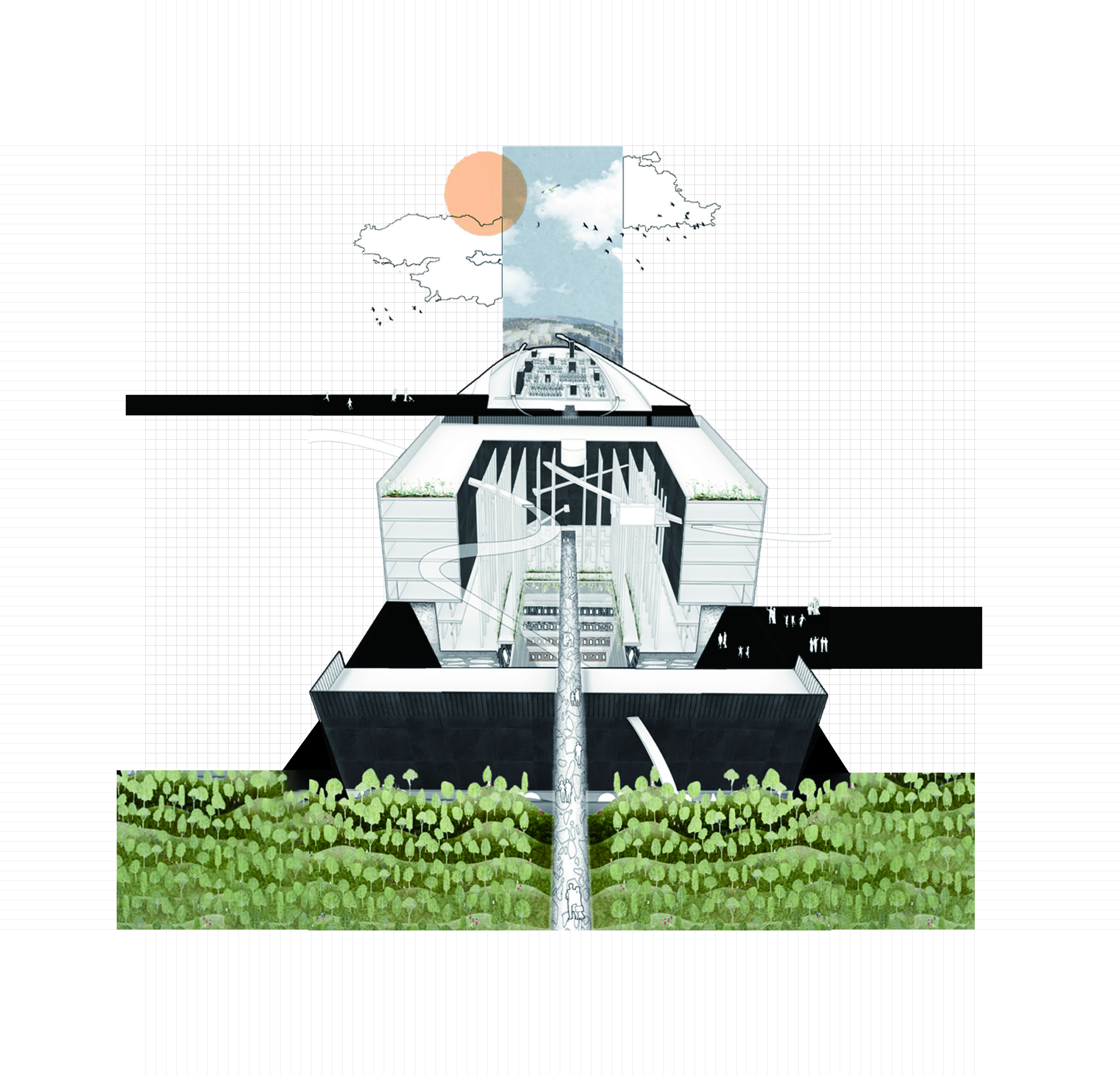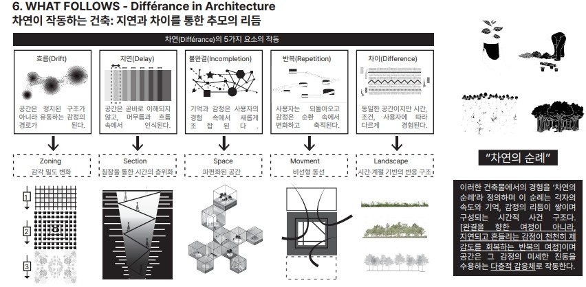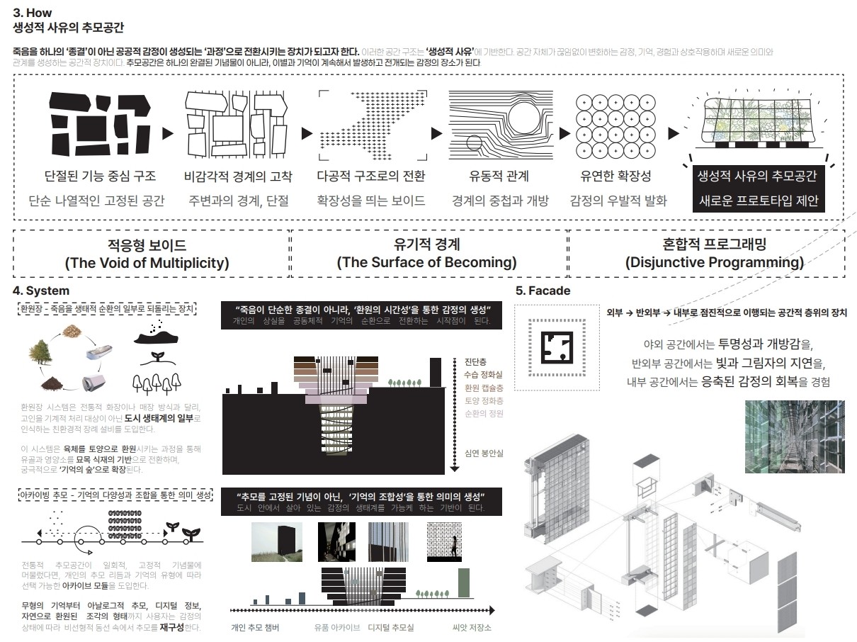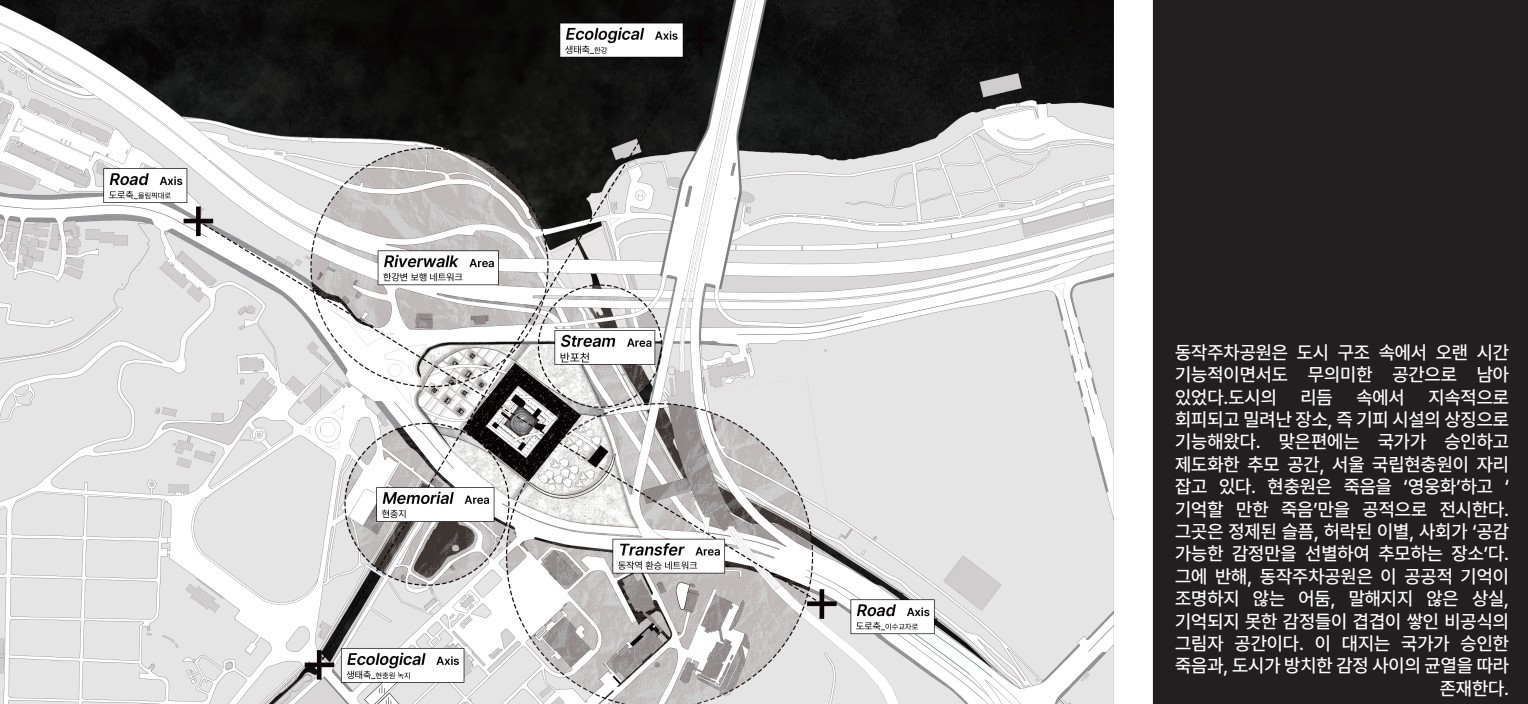 도시는 상실을 감지하지 못한다. 병원과 장례식을 빠져나온 죽음은 곧 일상에 파묻히고 , 개인의 이별은 공공의 망각 속에서 지워진다. 이 프로젝트는 도심의 심부에 되풀이 가능한 순례의 구조를 수직적으로 주입함으로써 기억을 붙잡지 않고, 오히려 잊을 수 있을 때까지 걷게 만드는 건축을 제안한다. 이 공간은 차연(Différance)을 기반으로, 고정된 의미나 완결이 아닌, 지연되고 반복되는 시간성을 품는 공간을 전개한다. 사용자마다 다른 상실의 속도와 리듬을 수용하며, 기억과 이별이 열려 있는 구조 안에서 추모가 이루어 진다. 죽음을 하나의 ‘종결’이 아닌 공공적 감정이 생성되는 ‘과정’으로 전환시키는 장치가 되고자 한다. 이러한 공간 구조는 ‘생성적 사유’에 기반한다. 공간 자체가 끊임없이 변화하는 감정, 기억, 경험과 상호작용하며 새로운 의미와 관계를 생성하는 공간적 장치이다. 추모공간은 하나의 완결된 기념물이 아니라, 이별과 기억이 계속해서 발생하고 전개되는 감정의 장소가 된다.
