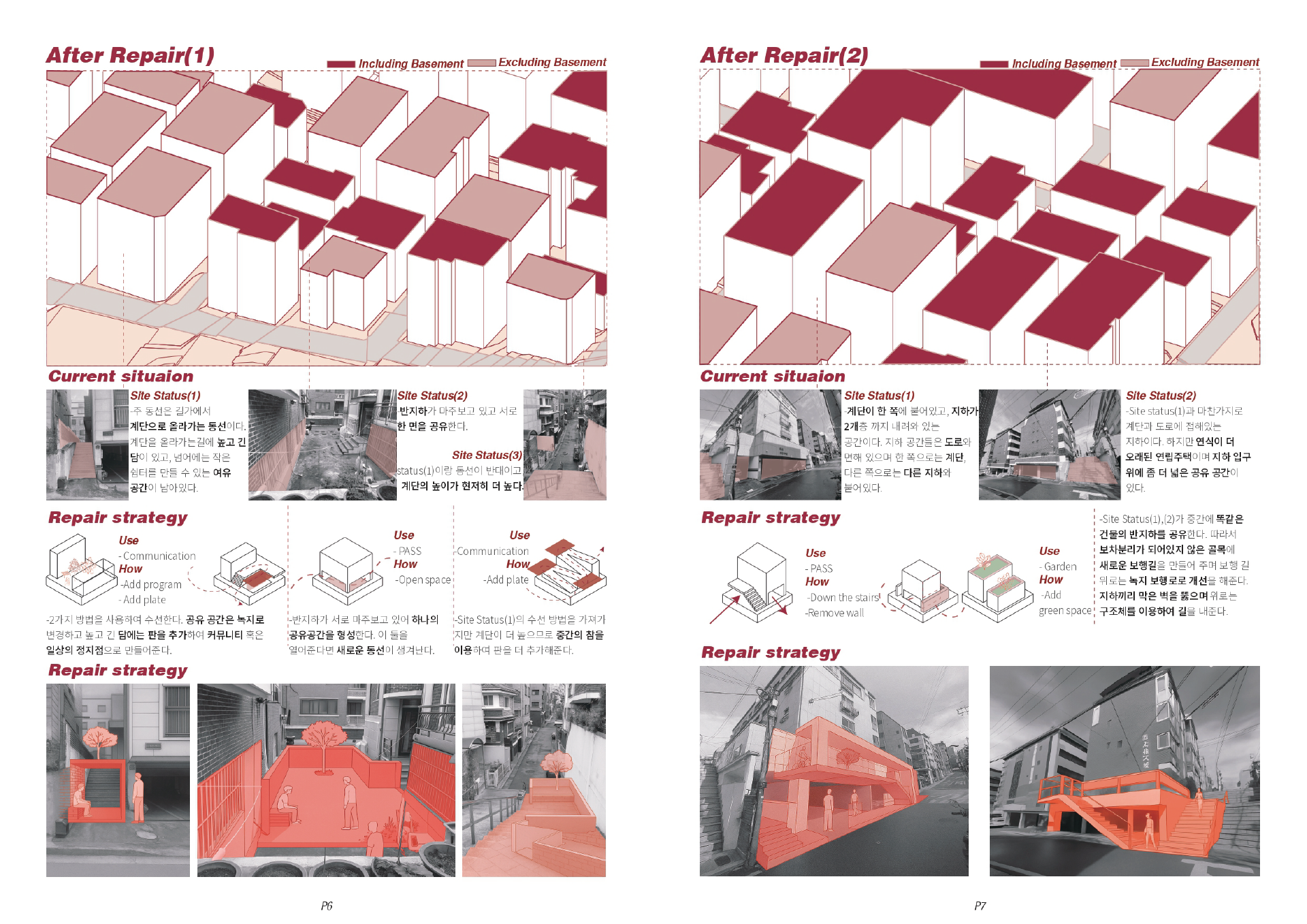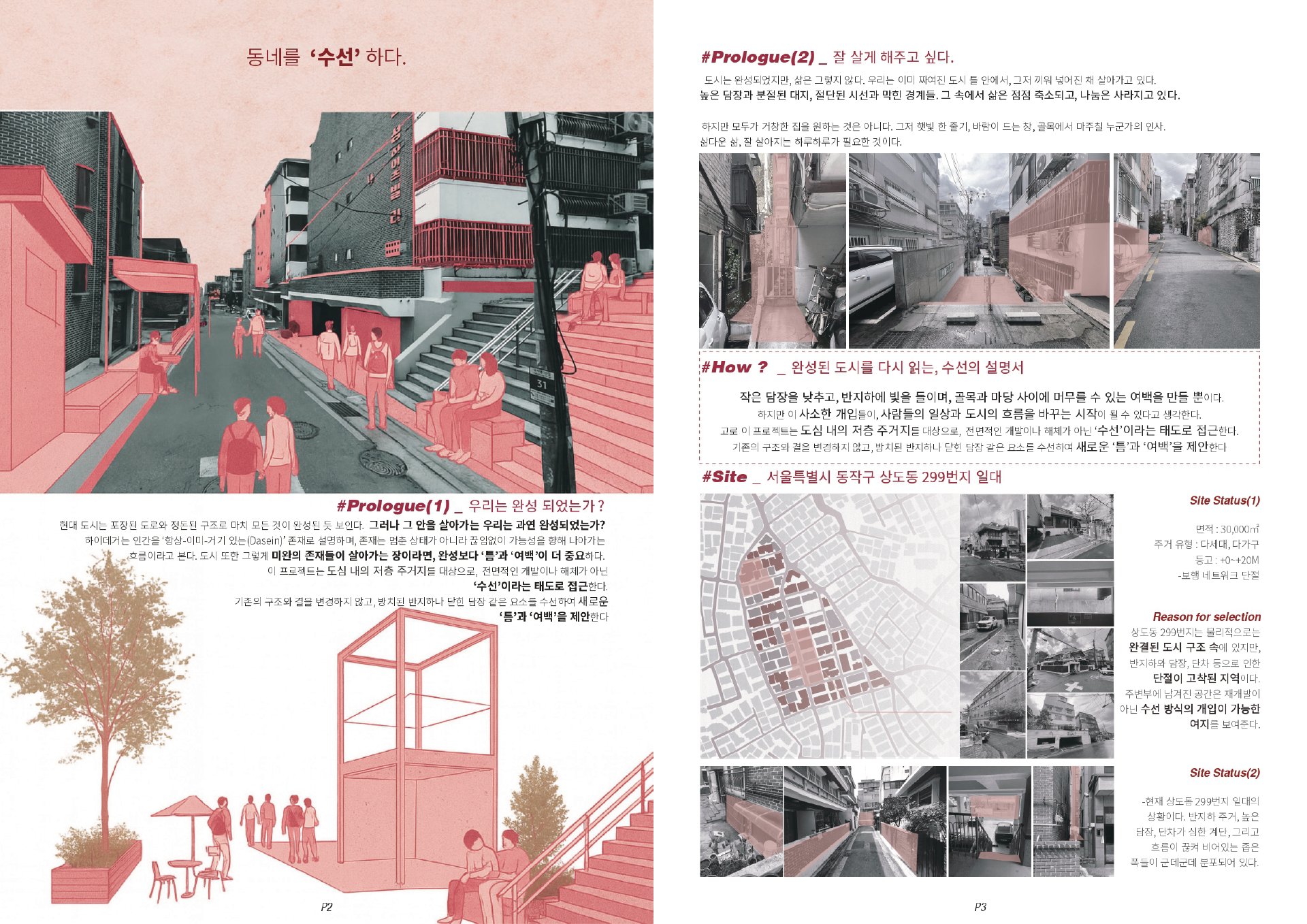 이 프로젝트에서 제안하는 수선은 작고 구체적이다. 담장의 높이를 한 뼘 낮춰 시선이 통과하게 하고, 반지하의 경계를 다층으로 조정해 햇빛과 환기를 들인다. 막힌 보행을 비껴 흐르게 하는 작은 패스를 열고, 벽의 두께를 조율해 틈을 만든다. 골목에 잠시 멈출 수 있는 턱을 남기고, 우수의 흐름을 드러내어 발걸음이 젖지 않도록 한다. 이러한 미세한 개입들이 쌓일 때, 동네는 다시 호흡하고, 사람들은 서로의 존재를 천천히 인지한다.