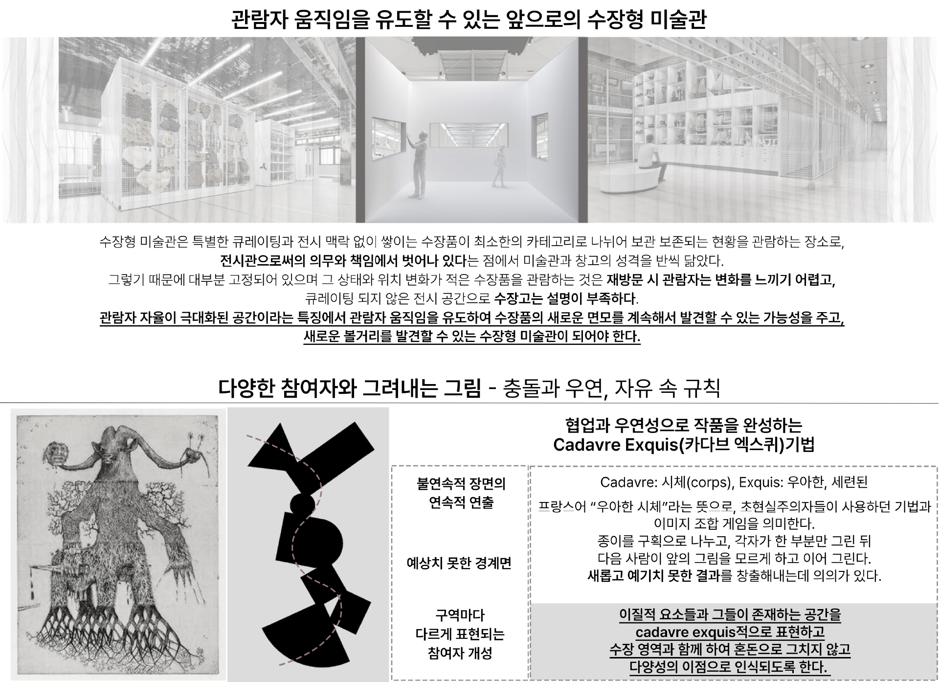시간이 지나며 이질적인 것들이 쌓이는 모습의 현대 사회를 수장고와 비슷하게 바라보았다. 수장고는 가치있는 예술품을 보존, 보관하는 곳이다. 회화부터 조각, 필름과 디지털까지 쌓이는 종류는 다양하고, 각각의 보관 방식과 보존의 의미를 지닌다. 수장고에 관람 영역을 더한 수장형 미술관 탄생 이후 대중의 개입은 수장고의 기존 기능적, 사회적 역할에 더해 열린 결말으로써 공간에 대한 이야기가 이어지게 했다. 따라서 열린 결말로써 이야기가 계속될 수 있도록 수장형 미술관 공간 탐구와 함께 앞으로 나아갈 수 있는 방향을 알아보고자 한다.
